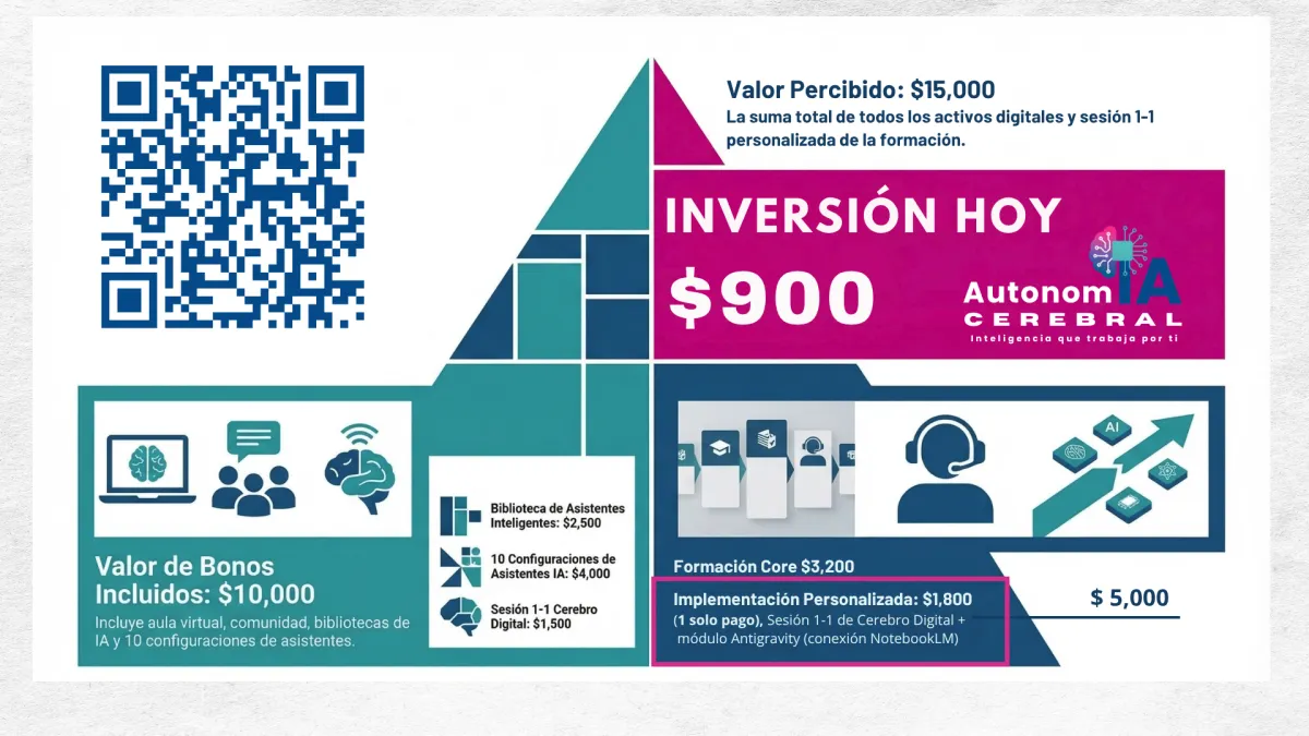 Los bonos de 1 solo pago: Sesión 1-1 (2 horas) para creación de Cerebro Digital con NotebookLM, y acceso a módulo Antigravity conexión NotebookLM se activará luego del día 7, junto con los demás bonos del programa (Periodo de Garantía).