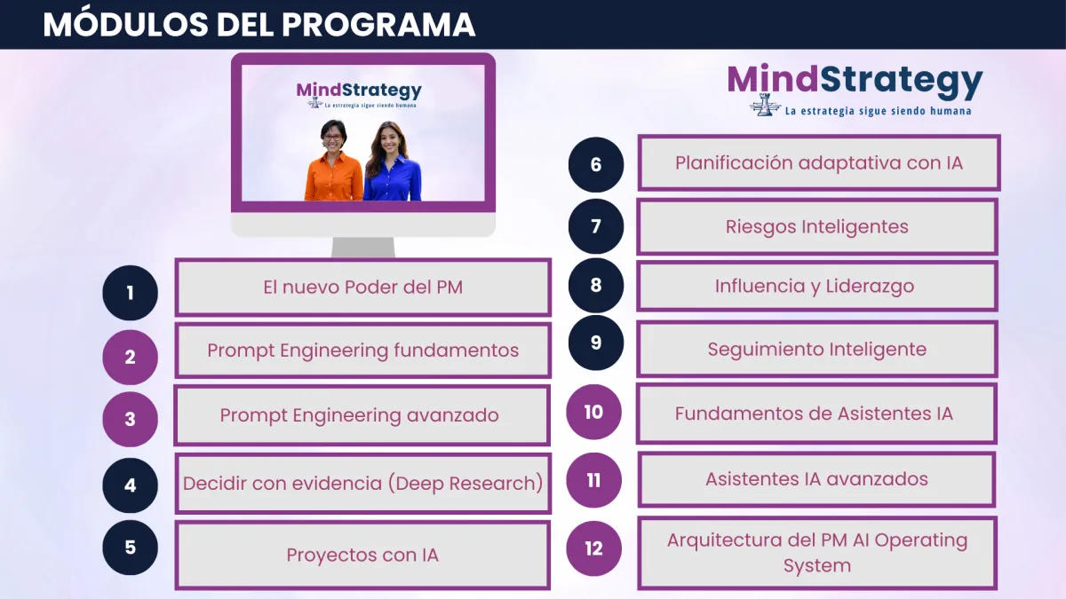 🤖Módulos de contenido exclusivo: 12 módulos con +40 leciones individuales, que cubren diferentes aspectos de la inteligencia artificial y su aplicación en la gestión de proyectos.